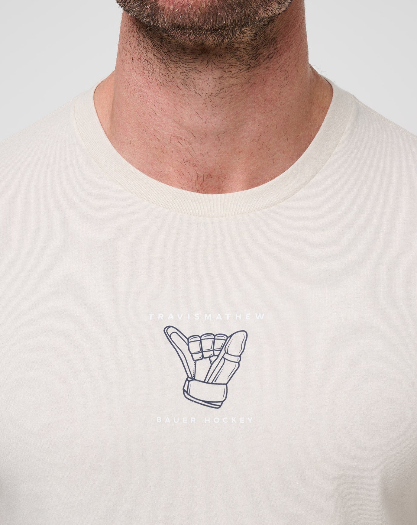 Hang loose in the BEACHWAY t-shirt. The exclusive TravisMathew x Bauer t-shirt features a goalie glove shooting the shaka sign. No worries on the ice or in the water.