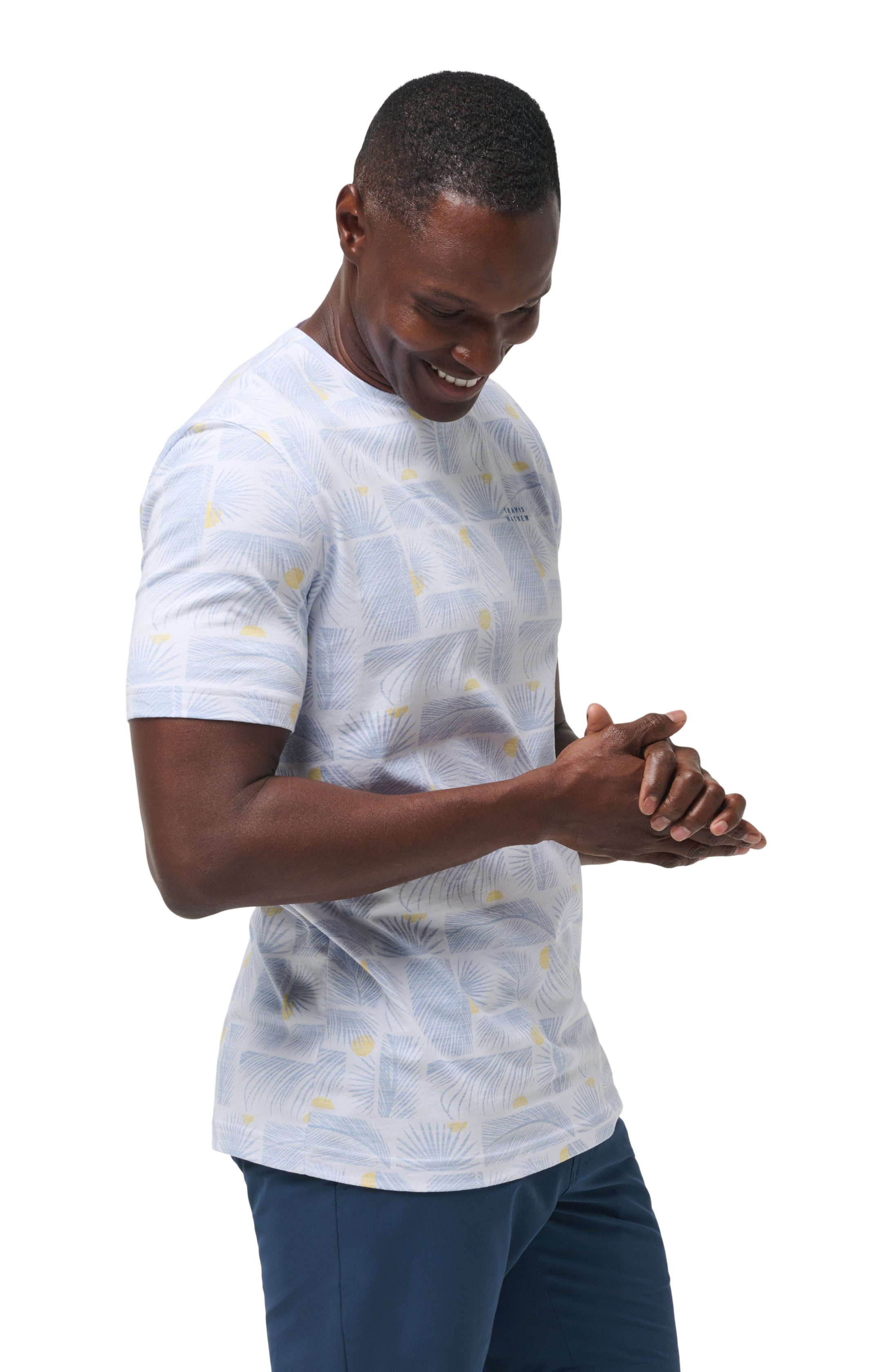 This guy will bring casual island vibes into any outfit. The CANCEL ALL CALLS tee was designed with a fresh. all-over pattern featuring rotating palm leaves and hidden suns. Don’t just plan your next vacation. BE the vacation.