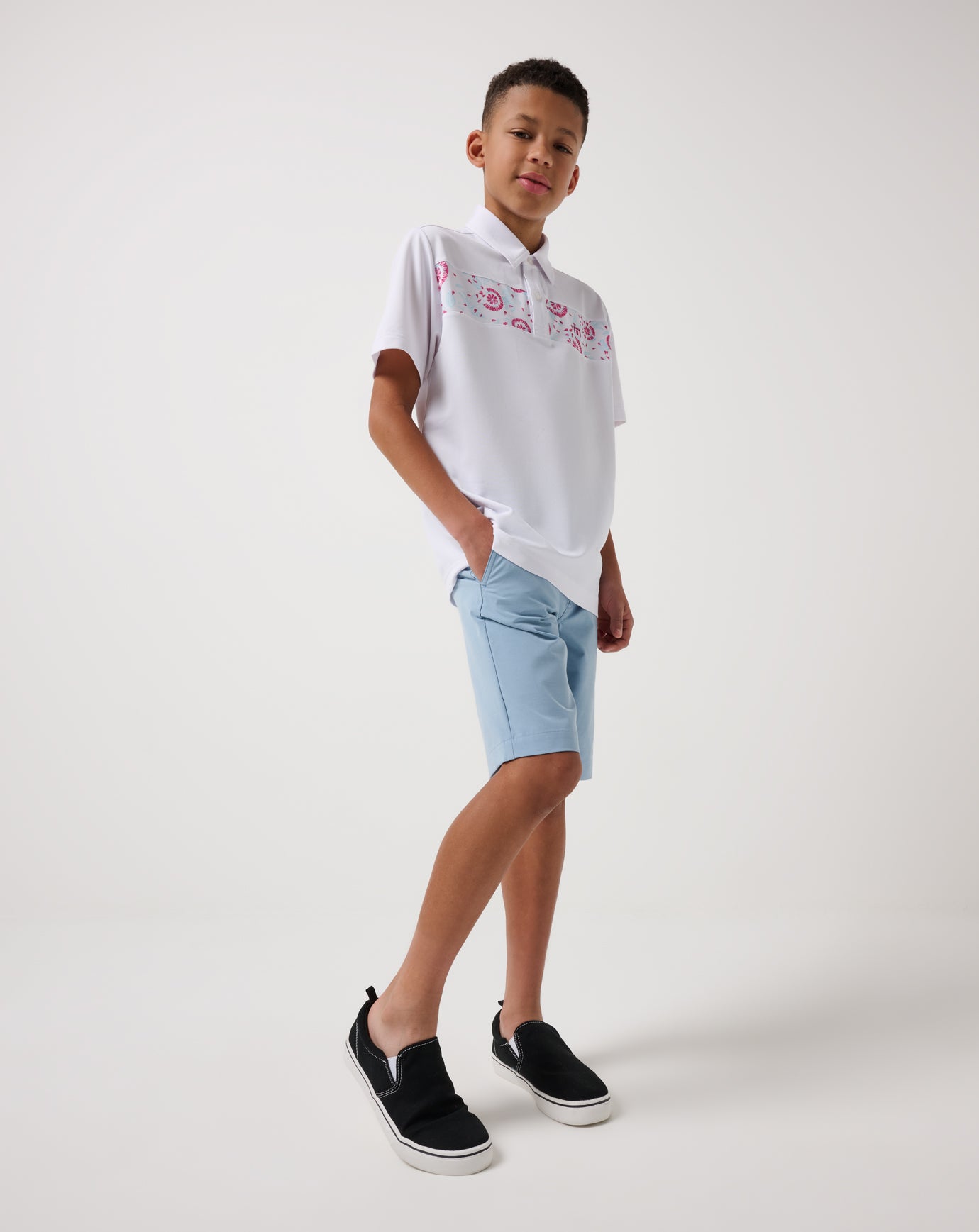 The YOUTH GOOD GOOD FLOURISH polo is the perfect blend of style and durability for your mini. Made from stretchy. recycled fabric. it’s built to keep up with his every move. from playtime to dinnertime. With a sleek chest stripe and our Flourish pattern. this polo effortlessly brings together classic charm with a cool. modern twist—so he’ll look sharp wherever the day takes him!