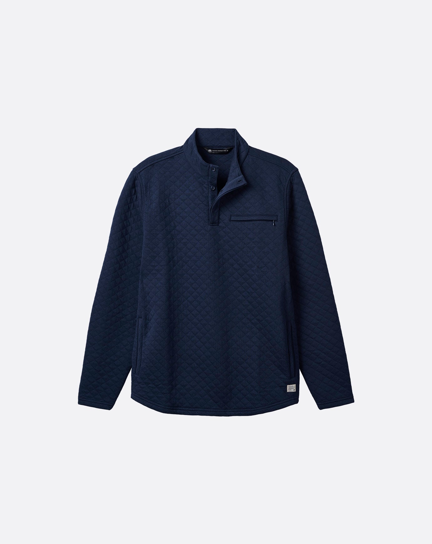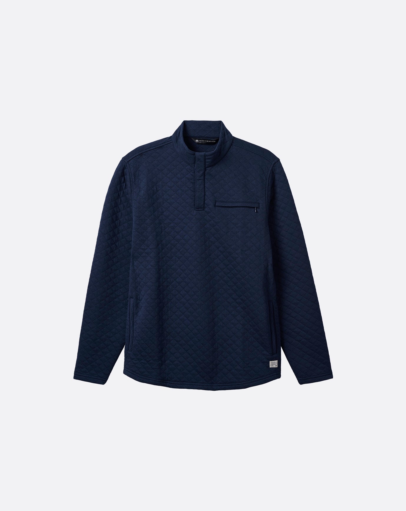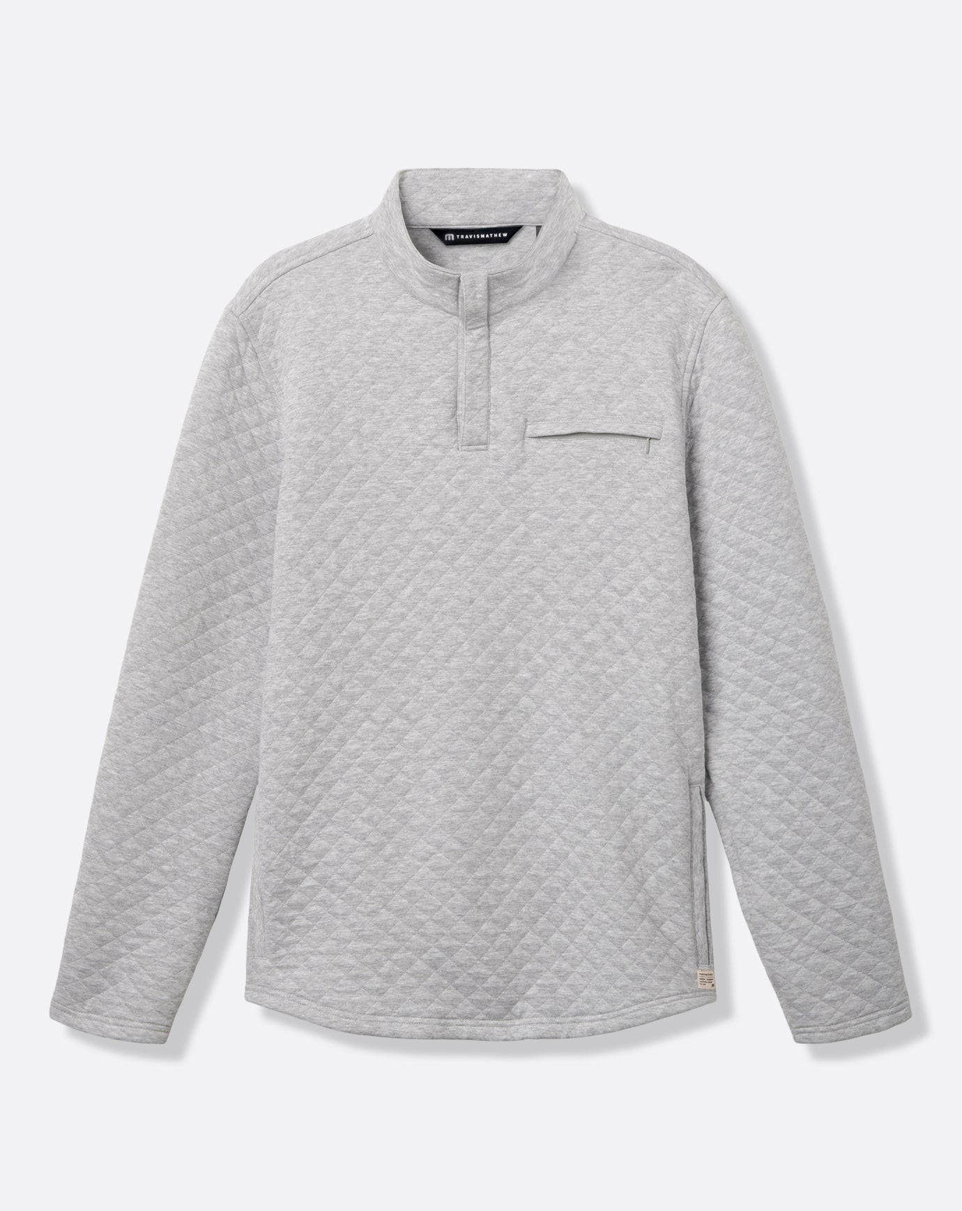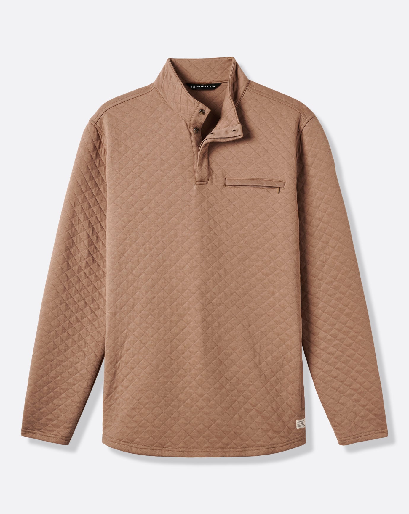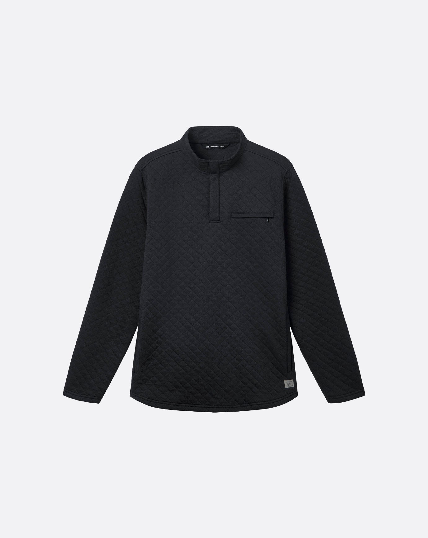 The TRANSATLANTIC pullover delivers quilted knit comfort. Crafted to elevate any look. the pullover jacket features a chest pocket with hidden button closure. a mock neck. and side-entry pockets.